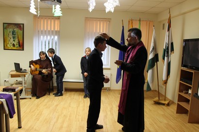 Po homilijos žodžių kunigas pašventino pelenus ir pabarstė jais susirinkusiųjų galvas, kviesdamas atsiversti ir tikėti Evangelija. Tuo pačiu metu visi įsijungė į giesmę „Nors dulkės ir kaitra“. Trumpos apeigos buvo baigtos visuotine malda ir palaiminimu, po kurio mokiniai ir mokytojai grįžo į pamokas, o paskui per pertraukas dėkojo ir geru žodžiu minėjo kunigo apsilankymą ir jo išsakytas mintis.