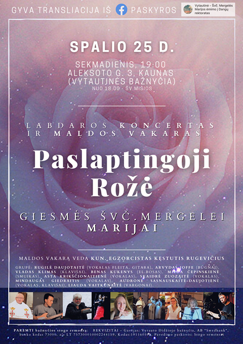 Spalio 25 d., sekmadienį, 19 val. Švč. Mergelės Marijos Ėmimo į dangų (Vytauto Didžiojo) bažnyčioje (Aleksoto g. 3, Kaunas) vyks Maldos ir labdaros vakaras-koncertas PASLAPTINGOJI ROŽĖ. Bus galima paaukoti šios bažnyčios stogo remontui.
