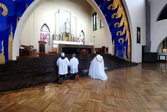Po katechezės vyko Švenčiausiojo Sakramento adoracija. Kalbėtas Rožinis. 12 val. iškilmingas šv. Mišias, kurias, kaip ir Rožinio maldą, tiesiogiai transliavo Marijos radijas, aukojo Kauno Švč. Jėzaus Širdies (Šančių) parapijos vikaras kun. N. Pipiras, koncelebravo Kauno Šventojo Kryžiaus (karmelitų) parapijos klebonas kun. Valdas Paura OCD.