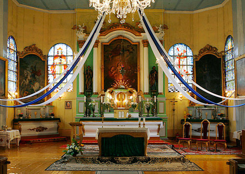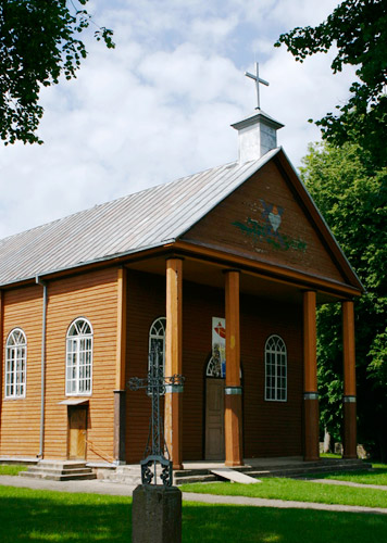 Senoji 1700 metų medinė bažnyčia buvo perstatyta 1874 m. Fasadas klasicistinis, su keturių kolonų portiku ir trikampiu frontonu. Didysis altorius papuoštas Šventosios Šeimos ir kitais paveikslais. Languose sudėtos vitražinės šventųjų figūros. Priešais bažnyčią stovi didelė medinė varpinė. Statyta 1874 metais.
