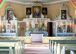 Bažnyčia liaudies architektūros formų, stačiakampio plano, su trisiene apside, žema zakristija ir dviem bokšteliais. Trys altoriai, didžiajame pakabintas aliejiniais dažais tapytas Šventosios Šeimos paveikslas. Altorius puošia aštuonios, Čikagoje nupirktos šventųjų statulos. Šventoriuje stovi medinė varpinė su dviem Bohumo gamybos varpais.