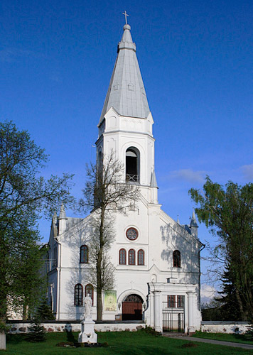 Įspūdingas pastatas yra mišraus stiliaus. Plokščiais piliastrais suskaidytos sienos, pusapskritės langų arkos, panašios nišos ir lygių traukų karnizai atrodo klasicistiškai. Aštuonkampis bokštas ir smailūs pinakliai ant fasadinės sienos – svetimi priedai. Taip pat ir aukšta bokšto piramidė su karūna viršuje. Bokšto akustinės angos labai didelės, su arkomis ir lygiais apvadais aplinkui. Viršutinis bokšto tarpsnis išsiskiria dvigubu karnizu su trikampių nišų eile ir kampiniais frontonėliais. Visi paviršiai tinkuoti. Vidaus erdvė padalyta į tris išilgines navas.