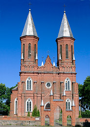 Bažnyčia neogotikinė, lotyniško kryžiaus plano, dvibokštė, su zakristijomis ir apside. Išlikęs nebenaudojamas 1632 m. liedintas varpas. Bažnyčioje sumontuoti garsaus vargonų meistro Martyno Masalskio 1903 m. sukurti vargonai.