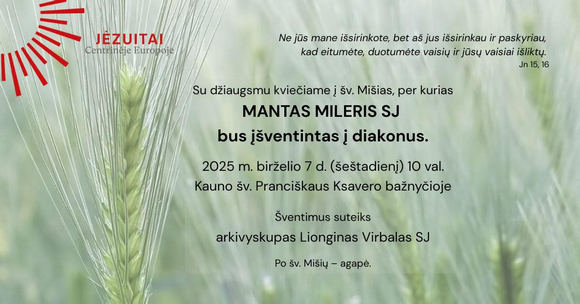 Birželio 7 d., šeštadienį, 10 val. Kauno Šv. Pranciškaus Ksavero (jėzuitų) bažnyčioje vyks Manto Milerio SJ diakonystės šventimai, kuriuos jam suteiks arkivyskupas Lionginas Virbalas SJ.