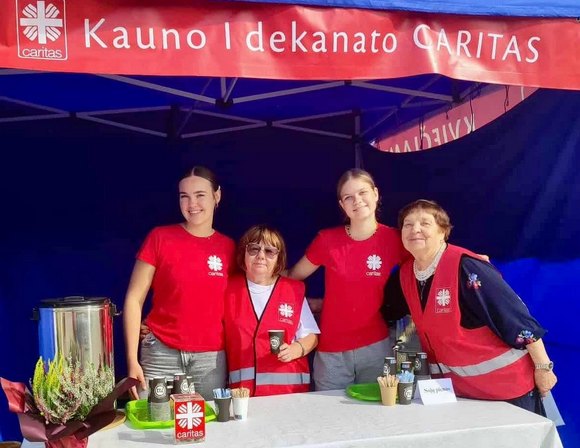 Atlaidų dalyvių laukia ir savanorės prie „Caritas klauso“ stalelio, pasirengusios papasakoti apie emocinės pagalbos liniją 60+ amžiaus žmonėms.