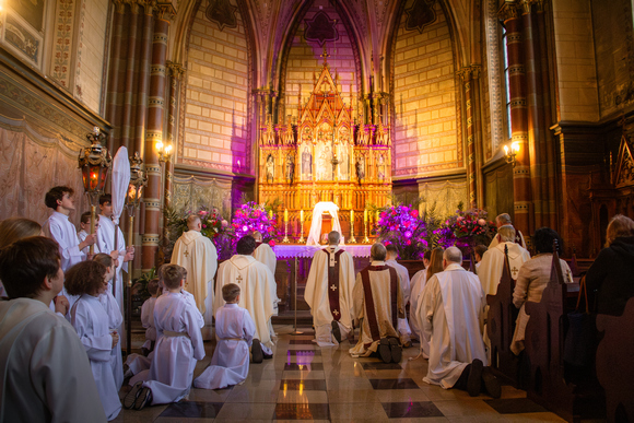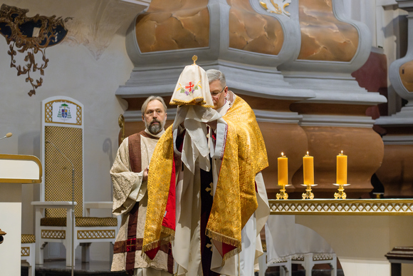Giedant Eucharistijos himną „Kūno paslaptį šlovingą“ Mišių pabaigoje Švč. Sakramentas buvo perneštas į koplyčią Didžiojo penktadienio Komunijai.