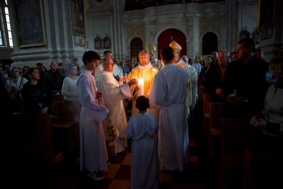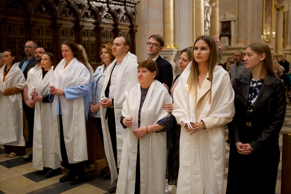 Neofitai – naujai pakrikštytieji – buvo pakviesti pereiti per šventovę ir įžiebti žvakeles kitiems žmonėms, dabar jau tapusiems tikėjimo broliais ir seserimis...