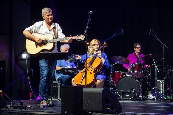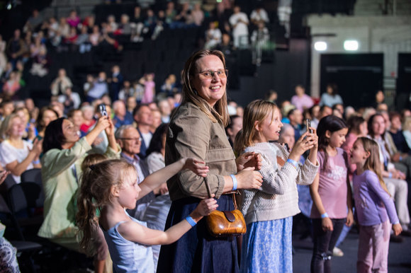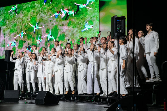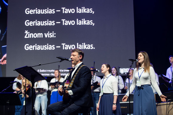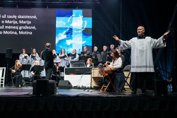 „Garbė Jėzui Kristui!“ – šitaip džiaugsmu alsuojančią halę pasibaigus Eucharistijos liturgijai pasveikino visų mylimas ir žinomas Linas Adomaitis, kartu su chorais „Dangi“ ir „Dangiukai“ bei jų vadove Danguole Beinaryte dovanojęs žmonėms šviesos ir vilties kupiną koncertą.