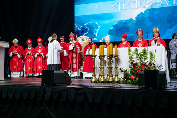 „Drįskite būti vilties žmonėmis! Būkime Jo vilties švyturiais mūsų broliams ir seserims, mūsų miestams ir mūsų Tėvynei. Švieskime ta nuostabia dovana, kuri spindi mumyse dangaus džiaugsmu“, – sakė arkivyskupas Kęstutis Kėvalas, vakarop halėje su LIetuvos vyskupais švenčiant Eucharistiją.