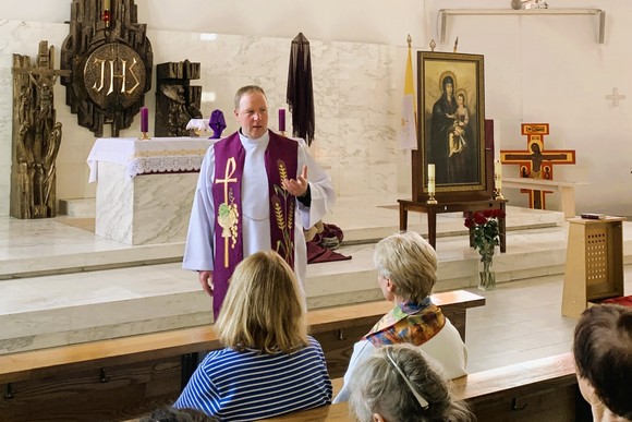 Po asmeninės atokvėpio valandėlės karitiečiai susirinko bažnyčioje ir klausėsi kun. Tomo impulso apie išpažintį. Pakviesti švęsti Sutaikinimo sakramentą, meldėmės su giesme Švenčiausiojo Sakramento adoracijoje.