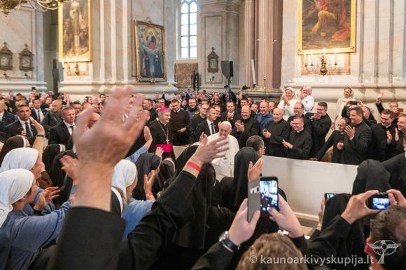 Ši katedra turi nuostabią garbę, kad būtent šioje vietoje Šventasis Tėvas Pranciškus kalbėjo ir mums, mūsų tautai – giedrai, šiltai, su humoru, kaip tėvas. Jautėme Šventosios Dvasios ir dangiškojo Tėvo artumą ir meilę mums, mūsų tėvynei Lietuvai“, – dalijosi liudijimu arkivyskupas Kęstutis Kėvalas, prisimindamas popiežiaus apaštališkąjį vizitą 2018 m. rugsėjo 23 d. Lietuvoje, kai Šventasis Tėvas, be kita, Kauno arkikatedroje bazilikoje susitiko su Lietuvos dvasininkais ir pašvęstaisiais.