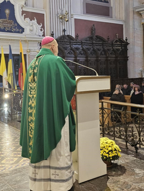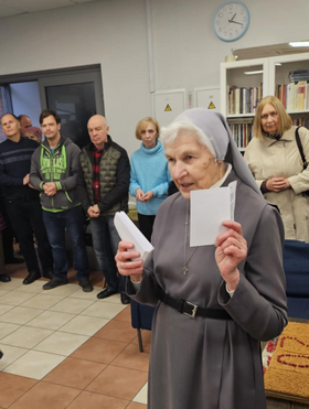 Baigiantis Šv. Mišioms popiežiaus Leono XIV palaiminimo raštas įteiktas seseriai Aloyzai Malinauskaitei SJE, ilgus metus besirūpinančiai adoracija Kauno arkikatedroje bazilikoje ir Švč. Sakramento bažnyčioje, nuolat ieškančiai, kad nepritrūktų visą parą Dievą garbinančių žmonių.