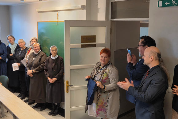 Adelės Dirsytės giminaitei Aušrai Valevičienei atidengus žyminčią lentelę, šią auditoriją ir joje pakabintą dailininko Vaido Šukio sukurtą Dievo tarnaitės paveikslą palaimino Kauno arkivyskupas metropolitas Kęstutis Kėvalas.