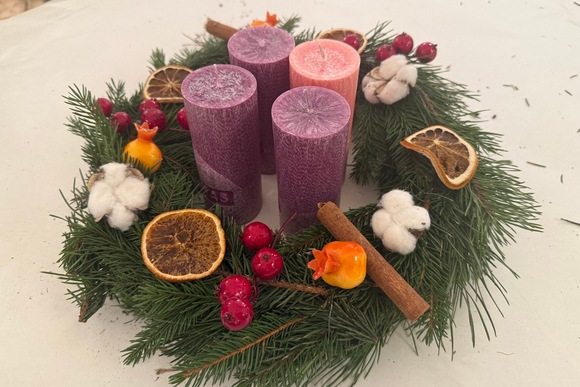 Ji priminė, kad vainiką galima susikurti ir iš paprastų dalykų: iš senų laikraščių susukto pagrindo, samanų, kelių eglišakių, džiovinto apelsino griežinėlio. Maži, niekuo ypatingi daiktai, bet jie tampa ženklu. Nes Dievas dažnai ateina per mažus dalykus, per kasdienybės šypseną, per tylų žvilgsnį, per trupinį šviesos.