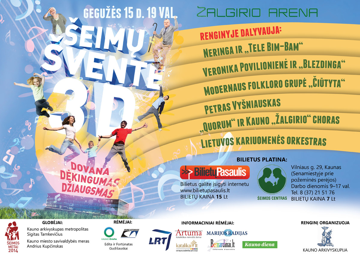 Gegužės 15-ąją, visame pasaulyje minint Jungtinių Tautų Organizacijos paskelbtąją Tarptautinę šeimos dieną, o mūsų šalyje tęsiant 2014-ųjų – krikščionių Bažnyčių ir bendrijų paskelbtų Šeimos metų – šventimą, visų kartų žmonės iš visos Lietuvos kviečiami atvykti į „Žalgirio“ arenoje Kaune rengiamą ŠEIMŲ ŠVENTĘ 3D: DOVANA, DĖKINGUMAS IR DŽIAUGSMAS.