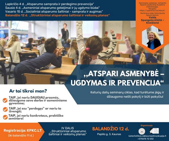 Kauno arkivyskupijos Katechetikos centras tikybos mokytojus ir visus ugdytojus kviečia į seminarų ciklą „Atspari asmenybė – ugdymas ir prevencija“.