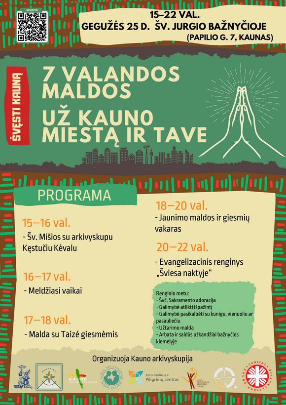 Gimtadienio šventėje gegužės 25 d., šeštadienį, dalyvaujame su įvairių arkivyskupijos organizacijų parengta programa. Tai maldos ir šlovinimo popietė – 7 VALANDOS MALDOS UŽ KAUNO MIESTĄ IR TAVE – Kauno Šv. Jurgio (pranciškonų) bažnyčioje (Papilio g. 7, greta Santakos parko).