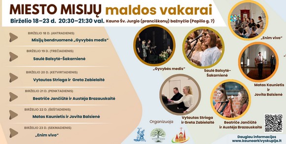 MIESTO MISIJŲ SAVAITĖS programoje – svečių mokymai, kauniečiams jau žinomi ir pamėgti susitikimai-pokalbiai senamiesčio kavinėje su kunigais, taip pat visiems atviri (ir nemokami) koncertai arkivyskupijos kiemelyje bei maldos vakarai Šv. Jurgio Kankinio (pranciškonų) bažnyčioje su šlovinimo giesmėmis.