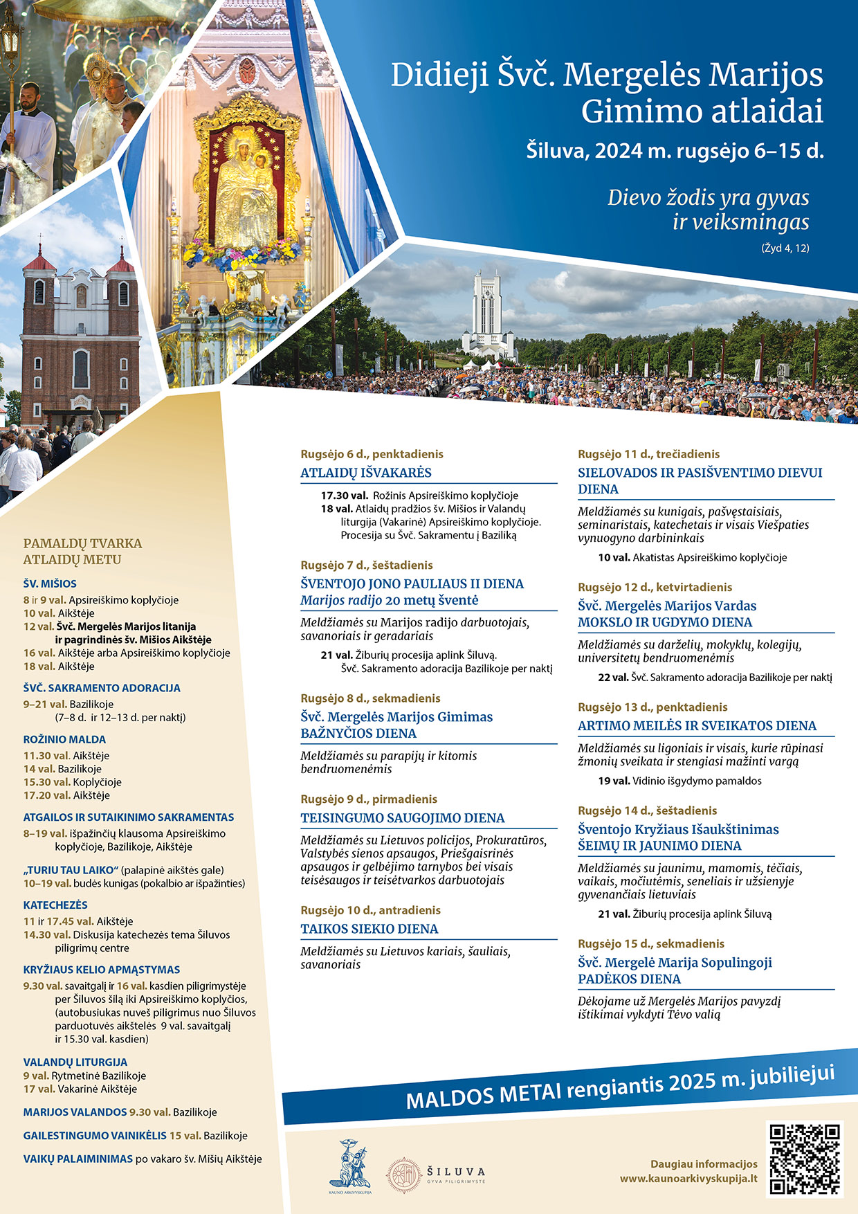 2024 metų Didieji Švč. Mergelės Marijos Gimimo atlaidai (Šilinės) Šiluvoje – rugsėjo 6–15 d. Juos švenčiame popiežiaus Pranciškaus paskelbtais Maldos metais ir rengiamės 2025-ųjų Jubiliejui. Atlaidų šūkis – iš Laiško žydams „Dievo žodis yra gyvas ir veiksmingas“ (4, 12). Pagrindinis atlaidų sekmadienis – rugsėjo 8-oji, Švč. Mergelės Marijos Gimimo ir Bažnyčios diena.