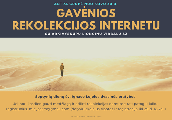 Sulaukėme netikėtai didelio dalyvių skaičiaus į šias Gavėnios rekolekcijas internetu (nuo kovo 23 d.) su arkivyskupu Lionginu Virbalu SJ. Dėl techninių apribojimų negalėjome priimti visų norinčiųjų.