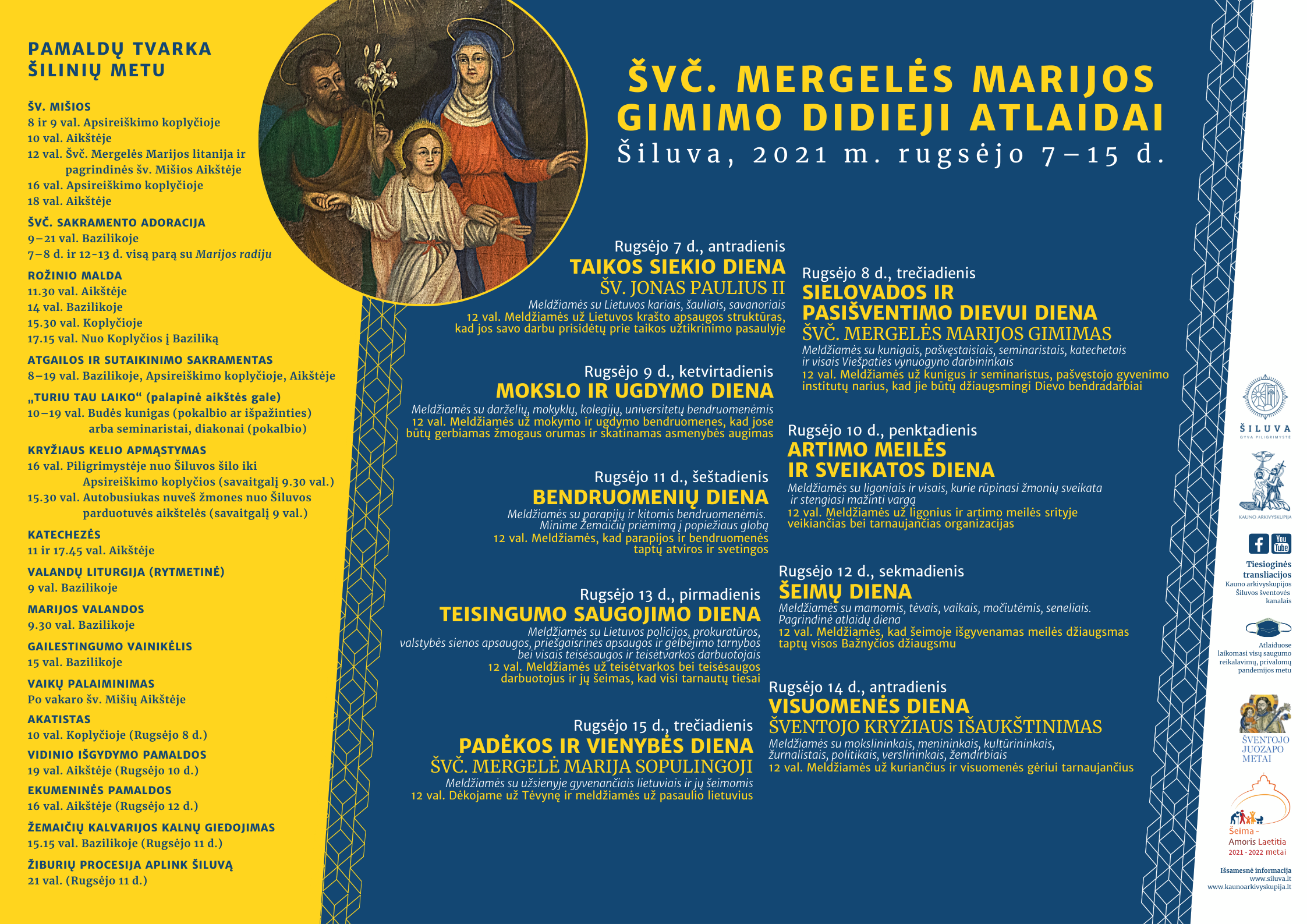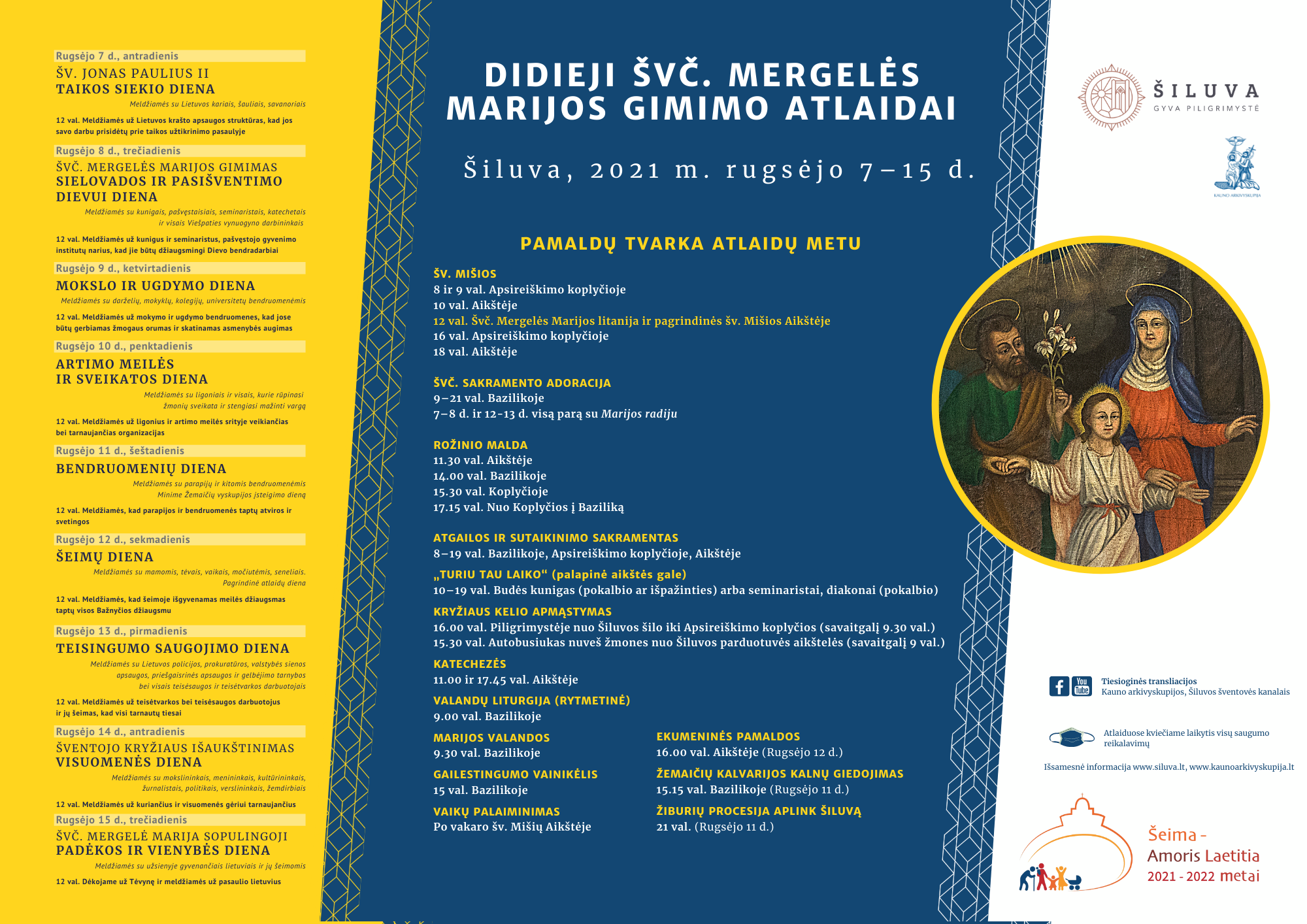 Rugsėjo 7–15 d. Šiluvos piligriminėje šventovėje švenčiame didžiųjų Švč. Mergelės Marijos Gimimo atlaidų (Šilinių) aštuondienį. Šiemet švenčiamais Šeimos-Amoris Laetitia ir Šv. Juozapo metais pagrindinė Šilinių diena – rugsėjo 12-osios sekmadienis – skiriamas šeimoms meldžiantis intencija, kad šeimoje išgyvenamas meilės džiaugsmas taptų visos Bažnyčios džiaugsmu. Tą patį sekmadienį 16 val. Šiluvos aikštėje bus švenčiamos Ekumeninės pamaldos.