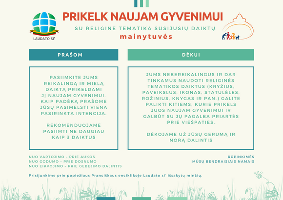 Popiežius Pranciškus enciklikoje LAUDATO‘si ragina mus rūpintis bendraisiais namais. Atsiliepdami į popiežiaus kvietimą Šiluvos atlaidų tikinčiuosius jau antrus metus kviečiame į religinės tematikos daiktų mainytuvių palapinę – PRIKELK NAUJAM GYVENIMUI. Kad mažiau pirktume ir vartotume, o daugiau dalytumės, mokytumės duoti, o pasiėmę padėkoti malda.