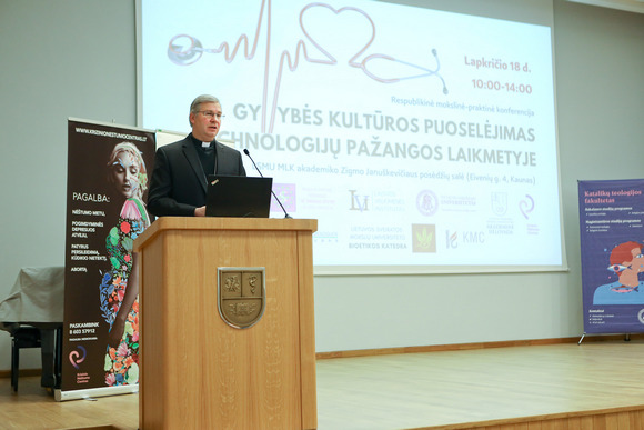 Renginio dalyvius sveikino ir konferenciją palaimino Kauno arkivyskupas metropolitas Kęstutis Kėvalas, sakydamas, kad gyvybės principo negerbimas sukuria slidaus šlaito efektą, vedantį prie vis nuožmesnių gyvybės principo pažeidimo. Technologijų pažanga sukūrė mums pagundų, kurių anksčiau nežinojo nei mokslas, nei žmonės. Technologijų pažanga turi vykti nesulaužydama gyvybės apsaugos principo nuo jos prasidėjimo iki natūralios mirties.