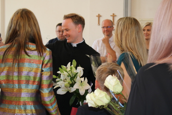 Liturgija užbaigta ypatingu naujai įšventinto kunigo bei visos bendruomenės palaiminimu. Šventė ir sveikinimai vėliau tęsėsi arkivyskupijos salėje.