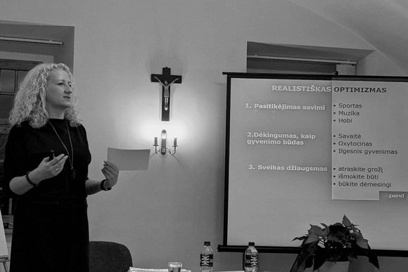 „Atsparumas yra perdegimo prevencija, tad svarbu atpažinti, kur esame. Tai reiškia ir neleisti krizėse mūsų emocijoms užgožti loginio mąstymo ir sprendimų“, – sakė Vaida Spangelevičūtė-Kneižienė, išsamiai pasidalydama, kaip ugdytis emocinį stabilumą, realistišką optimizmą, gebėjimą spęsti problemas, pasitikėjimą savimi, dėkingumą, sveiką džiaugsmą ir... discipliną, kai žmogaus dvasią sustiprina ir tokie primirštami dalykai, kaip sportas, geras poilsis, maistas, tyla.