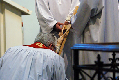 Kristaus Kančios pamaldas arkivyskupas pradėjo nuolankia atsiprašymo už visų nuodėmes malda, guldamas kniūbsčias priešais altorių.