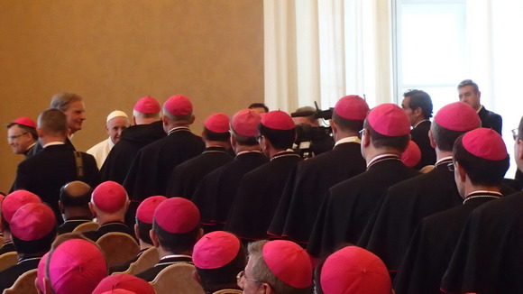Rugsėjo 13 d. naujieji vyskupai vyko į Šv. Petro baziliką. Šv. Mišioms vadovavo Dvasininkų kongregacijos prefektas kard. Marcas Quelletas. Po Mišių su vyskupais susitikęs popiežius Pranciškus savo kalboje drąsino nebijoti Bažnyčios žaizdų, nes tai – paties Kristaus kūno žaizdos, prie kurių reikia prisiliesti, sužadinti savo tikėjimą ir jas gydyti. Po susitikimo išsirikiavo ilga vyskupų eilė, o popiežius kiekvieną iš jų apdovanojo rankos paspaudimu, plačia šypsena ir Rožinio vėriniu.